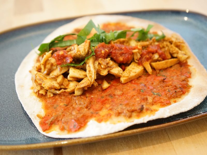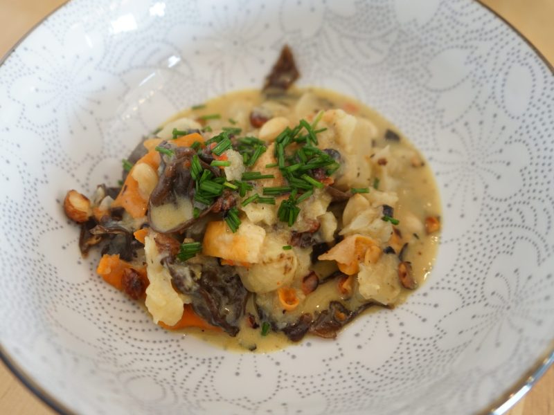 Dyrad saddle (Polyporus squamosus) can be a tough mushroom to cook, literally if you pick it too late, as it becomes rubber-like and inedible. Together with morels, it’s one of the mushrooms to kick off the mushroom season. Unfortunately, this year, there were very few morels around, so we had to be creative with Dyrad saddle. Young Dyad saddle in prima condition to pick, and the mushroom turned into kebap. We applied the same technique used to make home made chicken kebap, where you marinate the meat and then freeze it, after which you can make very thin slices of