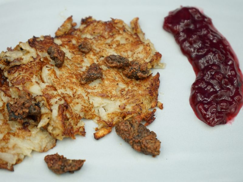Many countries have their version of potato pancakes and so does Sweden where they call it “Raggmunk”. In Sweden, they are typically served with bacon and lingonberry jam, which we both replaced by wild counterparts for which we already posted recipes previously. We replaced potatoes with Jerusalem artichokes, which are less starchy so this recipe requires a bit more flour then usual to achieve the right binding. In our first batch, we didn’t adjust yet and found out that increasing the amount of flour by 10% resulted in the perfect binding.