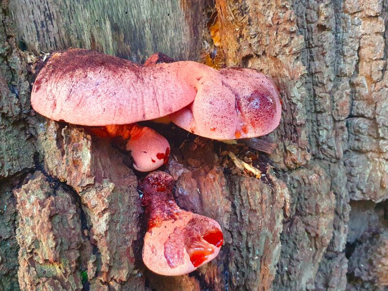 The beef steak mushroom (Fistulina hepatica) is a rather unique-looking mushroom appearing in the fall on oak trees or oak tree remains. As its name suggests, it resembles a piece of steak, including a blood-like juice coming from it when cut. The structure of this mushroom is also rather meat-like, which inspired us to make jerky out of it. Left: The beef steak mushroom growing on a tree, note the red juice drops that resemble blood. Right: mushroom prepared like traditional steak. The beef steak mushroom can be eaten cooked, but also raw, for example, as a topping for a