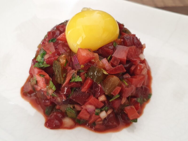 Not many mushrooms are good edibles raw. The beef steak mushroom (Fistulina hepatica), however, is one of the few that is. Because it has a meaty texture and look, it is a perfect mushroom to turn into a steak tartar. The original steak tartare is made with finely chopped raw beef, and has its origin in late 19th-century French cuisine. We swapped the beef for a beef steak mushroom and were very happy with the result! For a further wild twist, we replaced pepper with waterpepper (Persicaria hydropiper) and instead of using Worcester sauce, we used the liquid we had